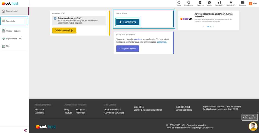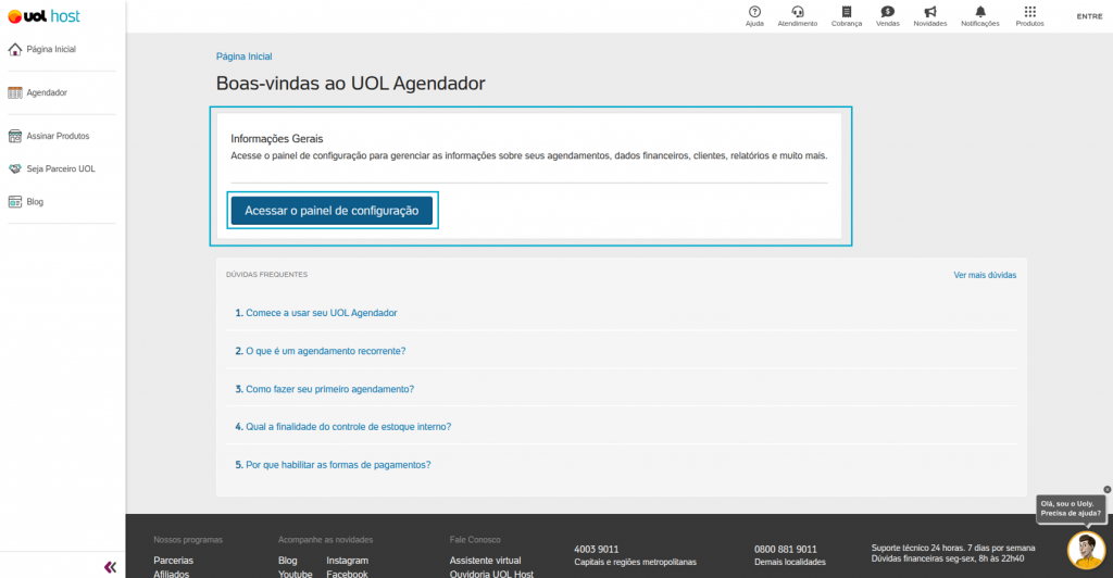 No Painel administrativo do Agendador, clique em “Acessar o painel de configuração“ para acessar a ferramenta de gestão do seu UOL Agendador: