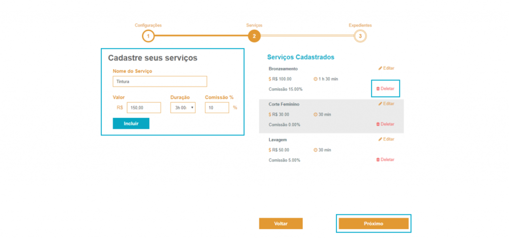 Nessa tela você poderá cadastrar os serviços que você prestará, indicando valor, tempo de duração e a comissão que será paga aos seus funcionários (se for aplicável). Existem alguns serviços pré cadastrados como exemplo e você pode apaga-los se quiser, clicando em ”Deletar”: