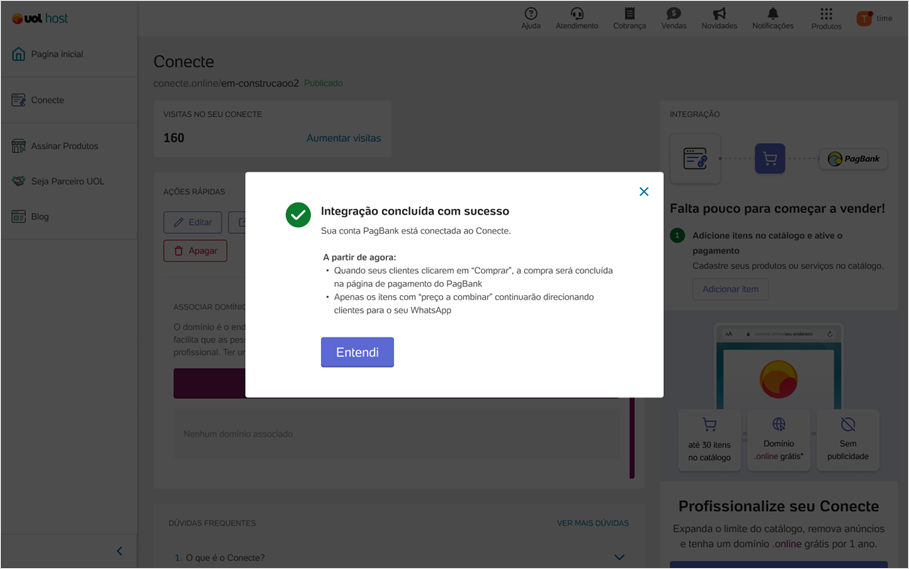 Siga as instruções exibidas até autorizar o uso da conta e pronto! A conta PagBank está conectada ao Conecte e o cliente já pode vender online. Caso o cliente já tenha produtos cadastrados, será exibida a mensagem a abaixo:
