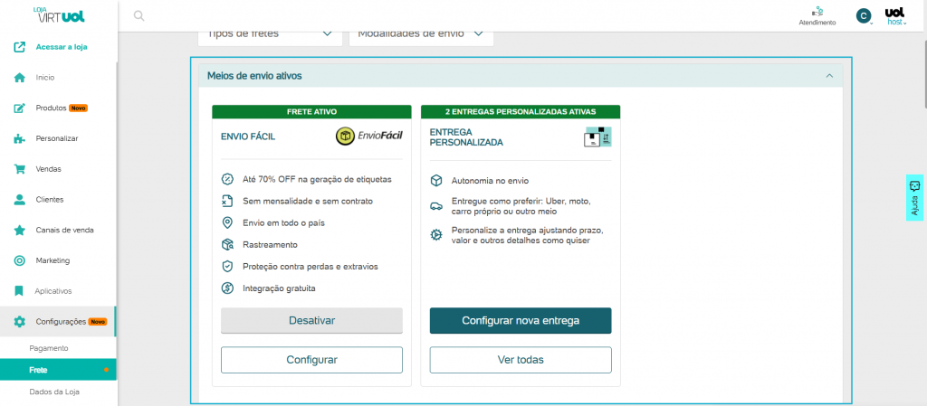 Dentro do seu painel de ”Gestão de frete”, é possível ver os meios de envio ativos da sua loja: