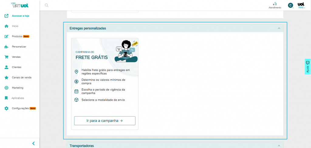 Na página inicial do Painel da loja VirtUOL, em Acesso rápido clique em ‘’Frete”;