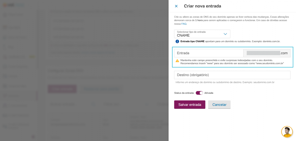 No campo “Destino”: Informe um domínio ou subdomínio existente. Em “Status da entrada” você pode “Ativar” ou “Desativar”