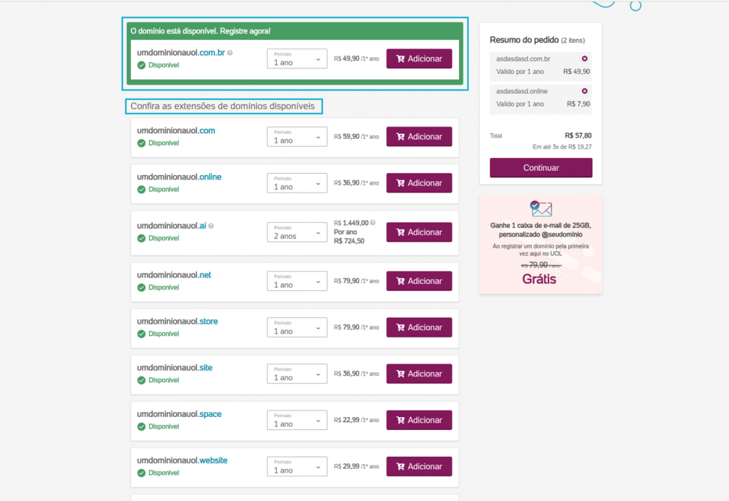 Abaixo, um exemplo de como aparecerá para você os domínios disponíveis.