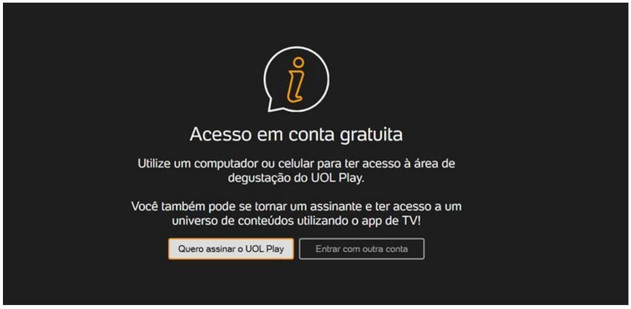 Se você tentar acessar pela TV, verá uma mensagem informando que o acesso gratuito deve ser feito por um computador ou celular, conforme a tela ilustrativa abaixo.